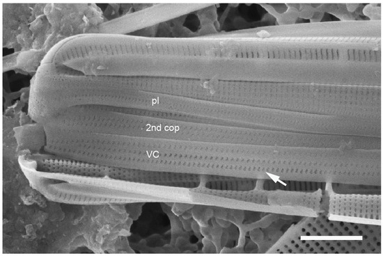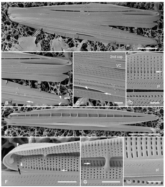 Homoeocladia contraria sp. nov. in SEM. (A–C) Holotype from Guam (GU52K-7). (A) Entire frustule. (B) Detail of apex, showing costae on exposed valve face with papilla at edge of valve depression (arrowhead), elevation indicated in edge view (black arrow); girdle bands [valvocopula (VC), 2nd copula, pleura (pl)] with bordered areolae; reproduced from Phytotaxa [35] with permission of the copyright holder, Magnolia Press. (C) Central portion of frustule showing some thin borders on vimines toward the distal end of striae (arrow). (D–F) Specimens from Palau. (D) Entire frustule showing interior and exterior valve faces and girdle bands, longitudinal break in striae (arrow) (PW2021-4-7). (E) Apex (PW2009-46 specimen), showing small openings of areolae in peri-raphe zone (white arrow), second line of areolae on apex of the more eroded valve (black arrow) and papillae on transverse costae (arrowhead). (F) Detail of mid portion showing thin borders on vimines toward the distal end of striae (arrow) and pitted border (GU68D-1B). Scale bars: (A,D) = 5 µm, (B,C,E,F) = 1 µm.