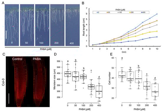 The impact of PABA on Arabidopsis primary root growth. (A) Root size of 6-day-old plants grown in 0 (control), 50, 100, 200, and 400 μM PABA-supplemented media. (B) Primary root elongation over time (n = 45). Day after germination (DAG). (C) Representative root tips of 6-day-old plants stained with the plasma membrane marker FM4-64 (red), grown in the absence (control) or presence of 200 μM PABA. The white dashed lines depict the limits of the meristematic zone. Bar, 100 µm. (D,E) Size of the meristem and number of cortex cells in the meristem. Data are shown as the means ± standard error (n ≥ 20 roots). The letters (a–d) indicate that the meristem size or cortex cell number differs from the control, as determined by a one-way ANOVA with the Tukey multiple testing corrections (p < 0.05).