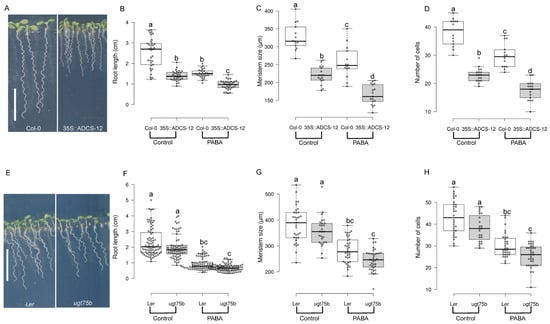 Endogenous PABA regulates root growth. Analysis of root development of Arabidopsis wild type, 35S::ADCS-12 transgenic, and ugt75b1 knock-out lines. (A–D) Phenotype analysis of WT (Col 0) versus 35S::ADCS-12. (A) Col 0 (WT, left panel) and 35::ADCS-12 plants grown in the absence of PABA. (B) Quantifications of the root length of plants shown in (A). (C) Size of the meristem. (D) Number of meristematic cells. (E–H) Phenotype analysis of WT (Ler) versus ugt75b1 loss-of-function mutant. (E) Ler (left panel) and ugt75b1. (F) Quantifications of the root length of plants shown in (E). (G) Size of the meristem. (H) Number of meristematic cells. White box plots indicate WT Col-0 (B,C,D) and Ler (F,G,H) plants, while grey box plots represent 35S::ADCS-12 (B,C,D) and ugt75b1 (F,G,H) plants, respectively. Data are shown as the means ± se (n = 30 for (B,F); n = 16 for (C,D,G,H)). The letters (a–d) indicate that the root length, meristem size or cortex cell number differs from the control, as determined by a one-way ANOVA with the Tukey multiple testing corrections (p < 0.05). Bar, 1 cm.