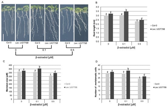 Effect of reduced free endogenous PABA levels on root development. (A) The phenotype of Arabidopsis WT (Col-0) and Lex::UGT75B plants grown in the absence (0) or in the presence of β-estradiol (0.1 and 0.5 μM). (B–D) Quantification of root length, meristem size, and number of meristematic cells, respectively. Data are shown as the means ± se (n = 35 roots). The letters (a–d) indicate that the root length, meristem size or cortex cell number differs from the control, as determined by a one-way ANOVA with the Tukey multiple testing corrections (p < 0.05). Bar, 1 cm.