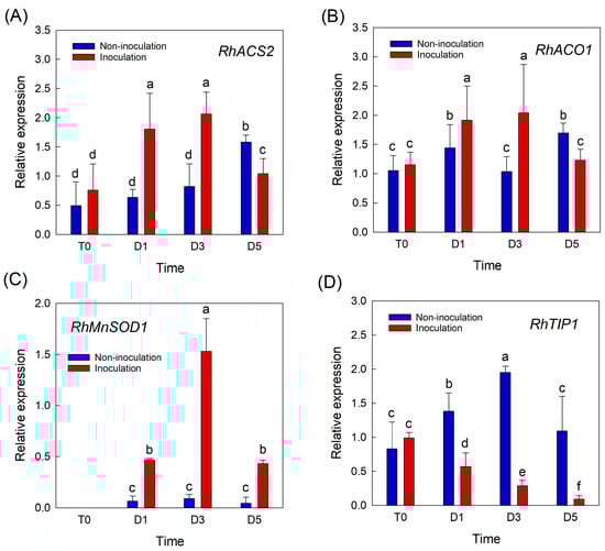 Effects of Botrytis cinerea infection on changes in relative expression of genes related to ethylene, ROS, and water transport in cut roses. RhACS2 and RhACO1, ethylene biosynthesis genes (A,B); RhMnSOD1, ROS-related gene (C); and RhTIP1, aquaporin-related gene (D). Gene expression levels in cut roses were analyzed at day 0 of transport (T0) and at days 1 (D1), 3 (D3), and 5 (D5) of the vase period. Cut flowers were sprayed with 30 mL of B. cinerea suspension (105 conidia mL−1) to induce GMD. Non-inoculated flowers were sprayed with 30 mL of distilled water. Data are shown as means ± SE (n = 6). Different letters above bars indicate statistically significant differences among treatments at p = 0.05 based on Duncan’s multiple range test.