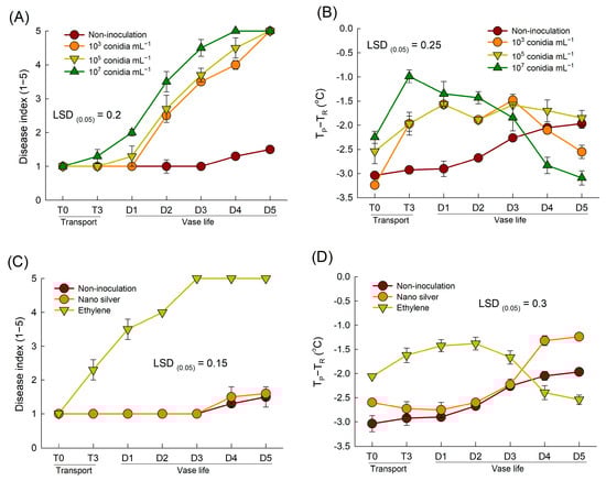Effects of different inoculum concentrations of fungal conidia suspension (A,B) and chemical treatments (C,D) on disease index (A,C) and petal temperature difference (TP-TR) (B,D) of cut roses. TP and TR are the temperature of petals and reference plate. Cut flowers were sprayed with 30 mL of three concentrations of Botrytis cinerea suspension (103, 105, and 107 conidia mL−1) to induce gray mold disease. Non-inoculated flowers were sprayed with 30 mL of distilled water. For chemical treatments, cut roses were treated with ethylene or nano silver before inoculating with Botrytis cinerea. Disease index was classified into five levels as 1, none; 2, slight symptoms (≤3%); 3, moderate symptoms (3–10%); 4, severe symptoms (11–50%); and 5, death of flowers (>50%). Disease index and petal temperature were evaluated on days 0 and 3 of transport (T0 and T3) and days 1–5 (D1–D5) of vase period. Data are shown as means ± SE (n = 24 for (A,C), and 12 for (B,D)).