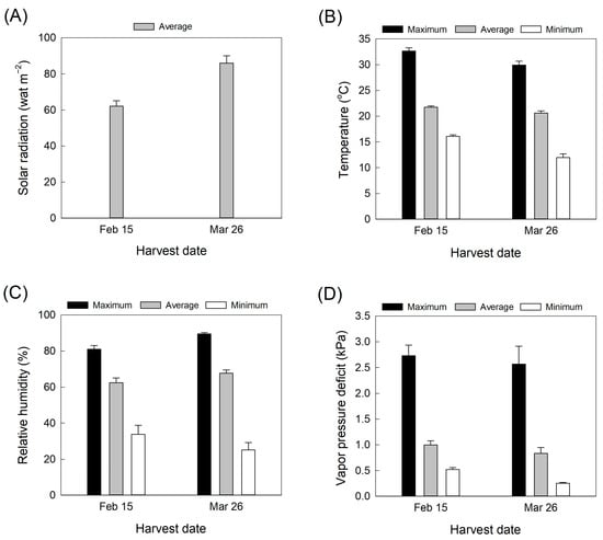 Changes in (A) solar radiation, (B) air temperature, (C), relative humidity, and (D) vapor pressure deficit in the greenhouse during cultivation. Environmental data are averages of daily values for 20 days before each harvest. Data are shown as mean ± SE (n = 20).