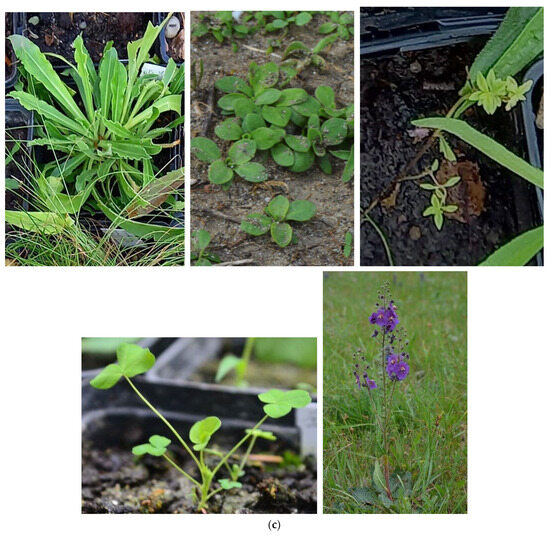 (a) The germinated seedlings are in pots in the greenhouse or planted in the ground. In the first row: Ajuga genevensis, Centaurea jacea, Festuca arundinacea; second row: Echium vulgare, Hypericum perforatum; third row: Festuca pseudovina, Festuca rupicola, Filipendula vulgaris. In these pictures, the plants are three months old, except for the Festuca arundinacea and F. rupicola, which are seven months old. (b) The germinated seedlings are in pots in the greenhouse or planted in the ground. In the first row: Lotus corniculatus, Melica transsilvanica, Plantago media; second row: Podospermum canum, Pseudolysimachyon spicatum, Salvia austriaca; third row: Salvia nemorosa, Salvia pratensis. In these pictures, the plants are three months old, except for the Melica transsilvanica, which are seven months old. (c) The germinated seedlings are in pots in greenhouse or planted in the ground. In the first row: Silene viscosa (two pictures), Thymus glabrescens; second row: Trifolium pratense and Verbascum phoeniceum, which was planted in the experimental plot. In these pictures, the plants are three months old, except for the Silene viscosa (1st picture), Thymus glabrescens and Verbascum phoeniceum, which are seven months old.