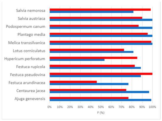 The estimated values of colonization parameters (frequency of mycorrhization (F%) referring to the proportion of roots that do not contain any mycorrhizal structures of the investigated control (blue) and inoculated plant species (red)).