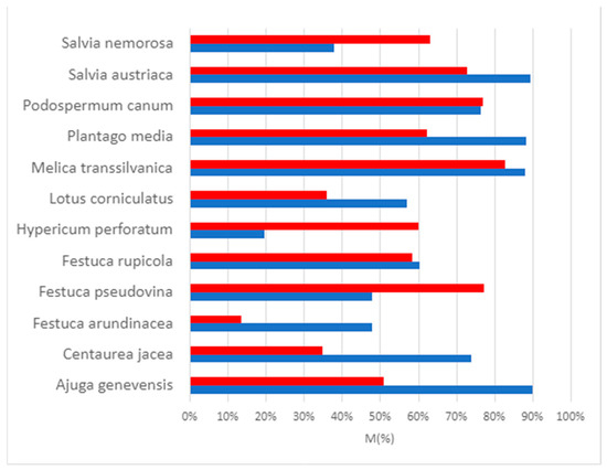 The intensity of mycorrhization (M%) of the investigated control (blue) and inoculated plants species (red).