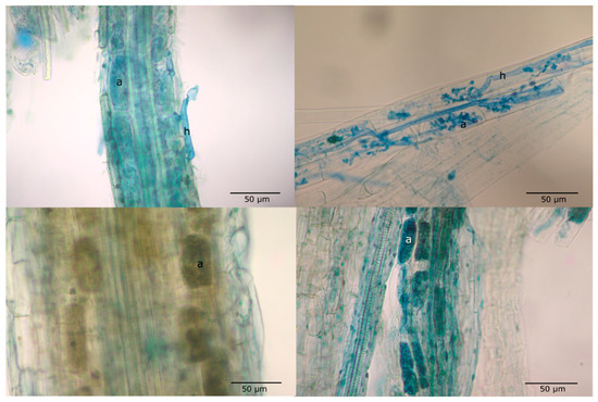 Microphotos on a root of a control (upper left) and an inoculated specimen (upper right) of Melica transsilvanica, and an inoculated (bottom left) and a control specimen (bottom right) of Salvia nemorosa, taken with Nikon Optiphot-2 research microscope, scale bars = 50 μm, arbuscules (a) and hyphae (h) are marked.