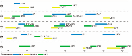 After a series of readjustments and optimization, the 33 core primer pairs were finally grouped into five categories (M1–M5), each having four, eight, nine, six, and six primer pairs. Of the 33 core primer pairs, a total of 11 primer pairs were redesigned and optimized to suit the m-PCR system (Table S5; Figure 1). Our aim was to combine as many SSR markers as possible in one multiplex PCR. However, due to fluorescent dye and size overlaps, as well as the presence of stutter bands, some polymorphic SSR markers were excluded from multiplexing; hence, 33 core primer pairs were selected as candidates for the multiplex PCR. For convenience, only two fluorescent dyes were used in the M5 group. Due to the disparity in the number of primer pairs per reaction, we used the following proportions: 8 μL 2 × PCR MASTER MIX, 0.2 μL of each primer. With the remaining volume filled up with ddH2O, the total reaction volume was 15 μL. The final PCR protocol was as follows: an initial 3-min denaturation at 94 °C, 35 cycles for 30 s at 94 °C, 30 s at different annealing temperatures (Table 2), and 1 min at 72 °C; and a final extension for 5 min at 72 °C. Transferability of these five multiplex systems were gauged based on the amplification rate (Table S6). The amplification rate ranged between 92% and 100% across species (average of 99%), with primer pair JR04 having the lowest amplification rate.