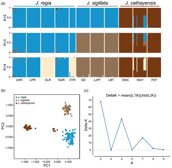 Genetic structure of three walnut species. (a) Bayesian clustering of individuals from 11 Juglans populations. (b) Principal coordinate analysis (PCoA) plot of the three Juglans species based on Nei’s genetic distance. Each color represents one morphological species. (c) Inference of the optimal K value using the DeltaK (ΔK) method.