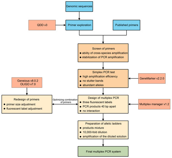 To improve the efficiency of PCR amplification, we developed an m-PCR amplification system using the selected primers. The Multiplex Manager tool, version 1.2 (http://www.multiplexmanager.com/about.php, accessed on 28 March 2019), was used to design and optimize the m-PCR amplification system, with the selection criteria set as follows: 10 as the maximum number of loci per reaction, 100 as the batch of iteration runs, 7 as the complementarity threshold, and 40 as the minimum distance between loci of the same dye color. To optimize the combinations of the primers, we used Geneious software, version 8.0.2, to redesign the primer sizes and their fluorescent dyes until a stable multiplex PCR primer combination was achieved [54]. We used Oligo software, version 7.0 (DBA Oligo, Inc., Colorado Springs, CO, USA), to redesign the primers [55]. This process was repeated until a satisfactory m-PCR amplification system was attained. We then optimized reaction conditions by conducting gradient experiments on the total volume of reactions (15 μL, 20 μL, and 25 μL), the volumes of primers (0.1 μL, 0.2 μL, 0.3 μL, and 0.5 μL), and the optimal annealing temperature of each m-PCR reaction (set at 1 °C per gradient, with a total of 5 gradients).