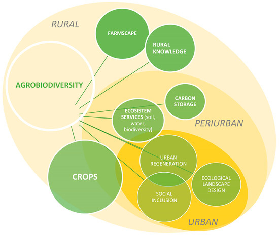 Schemes of the main services derived from the use of agrobiodiversity in rural, peri-urban and urban areas. Circles represent the main functions that agrobiodiversity exerts in each ambit. Overlapping between circles represents interconnected functions; overlapping between landscape types represents shared functions among rural, peri-urban or urban areas. (Credit: R. Biasi).