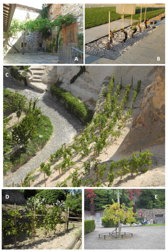 The multifunctional use of Vitis vinifera L. in urban contest and multi-scaled landscape design example; from single vine architectures (A,E), to vine rows (B) and small-scaled vineyards (C,D). (A), San Venanzo, Umbra Region Italy; (B) Surrau Winery, Sardinian island Italy; (C) Argos Hotel garden, Üçhisar Turkey; (D) gardens of Aragonese Castel, Ischia island Italy; (E), parking area, Meran Italy (Photos credit: R. Biasi).