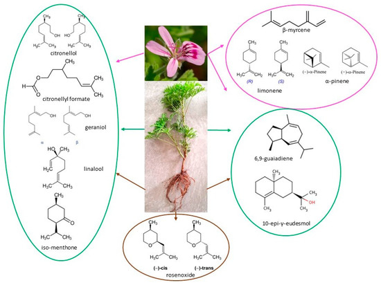 Furthermore, Figure 1 presents the primary volatile components of Pelargonium plant species, according to data from the literature.