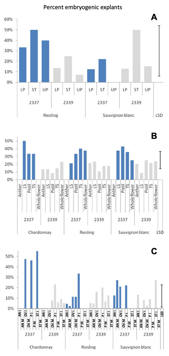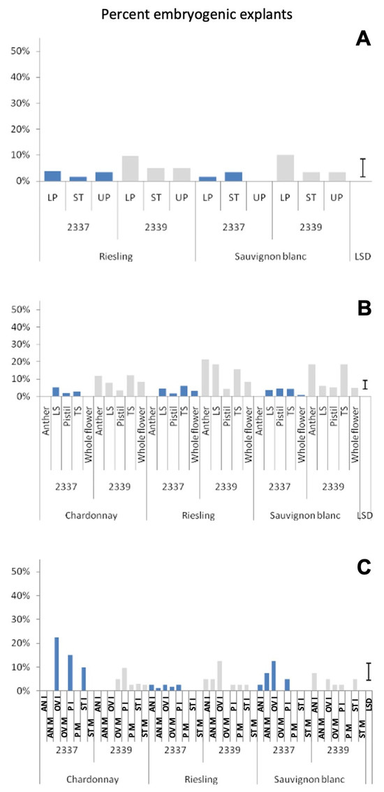 Percent of cultured Vitis vinifera cultivar explants producing calluses in two media. (A)—Experiment 1; (B)—Experiment 2; (C)—Experiment 3. LS—Flower bud cut longitudinally, TS—Lower part of flower bud cut horizontally, AN—Anther, OV—ovary, ST—style and stigma, LP—Lower part, UP—upper part, P—Pistil, I—immature (explant taken from a young flower bud < 1.5 mm) and M—mature (explant taken from a larger flower bud > 1.5 mm). LSD—Least Significant Difference.