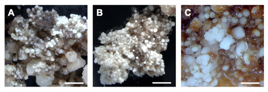Somatic embryos of: (A) Sauvignon blanc (bar = 2 mm); (B) Chardonnay (bar = 3 mm) and (C) Riesling (bar = 1 mm) cultivars induced on media 2339 using cut flowers as the explant.