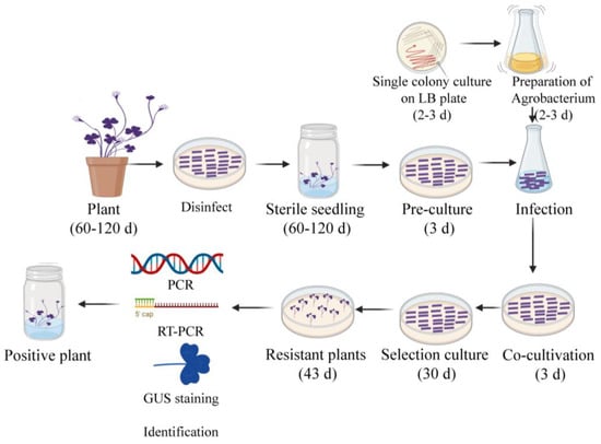 Xiao, Y.; Tuo, W.; Wang, X.; Feng, B.; Xu, X.; Ahmad, S.; Zhai, J.; Peng, D.; Wu, S. Establishment of a Rapid and Effective Agrobacterium-Mediated Genetic Transformation System of Oxalis triangularis ‘Purpurea’. Plants 2023, 12, 4130. https://doi.org/10.3390/plants12244130