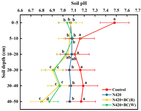 Overall, aside from N420, soil pH showed a decreasing trend with profile depth. Compared with the control treatment, the two added BC treatments showed significant decreases in soil pH across all profiles, such as pH decreasing from 7.07 to 6.80 in the N420 + BC(R) treatment, and pH decreasing from 7.04 to 6.87 in the N420 + BC(W) treatment (Figure 1). The pH was not significantly altered in the N420 + BC(R) and N420 + BC(W) treatments compared to the N420 treatments at 0–5, 5–10, and 10–20 cm profile depths, but the pH was significantly lower in the N420 + BC(R) and N420 + BC(W) treatments than the N420 treatment at 20–30, 30–40, and 40–50 cm profile depths. Compared to N420, the pH in N420 + BC(R) and N420 + BC(W) treatments decreased by 0.26 and 0.19 units, respectively, at 40–50 cm depth. The magnitude of pH across the profile was control > N420 > N420 + BC(W) > N420 + BC(R). Generally, the pH in N420 + BC(R) and N420 + BC(W) treatments showed a significant reduction in the subsoil profile (20–50 cm).
