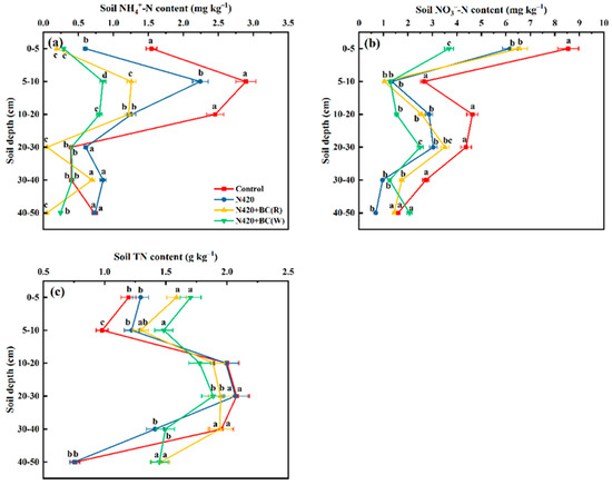 Soil NH4+-N contents tended to increase from the 0–5 cm to 5–10 cm profile and thereafter decreased with increasing depth of the soil profile (Figure 2a). For the top 5–10 cm soil, the NH4+-N contents were in orders of control > N420 > N420 + BC(R) > N420 + BC(W). Compared to N420, the NH4+-N contents were reduced in soil profiles of the BC-amended treatments, with 43.9–62.1%, 33.8–91.5%, and 66.8–93.1% significantly lower NH4+-N contents in the 5–10, 20–30, and 40–50 cm soil profiles, respectively. Moreover, NH4+-N contents were significantly lower at the 5–10, 10–20, and 30–40 cm profiles in N420 + BC(W) than in N420 + BC(R).