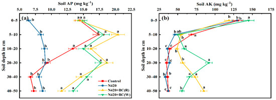Soil-available-P contents did not change with a similar trend along with the 0–50 cm profile depth (Figure 3a). Compared to N420, application of BC significantly increased the available P contents in all profiles approximately 2-fold. In particular, at the 5–10 cm profiles, N420 + BC(R) and N420 + BC(W) had significantly more available P than N420, respectively. Even below 30 cm of the profile, soil-available-P contents increased by 3.3–10.1% under N420 + BC(W) compared with N420 + BC(R) and N420.