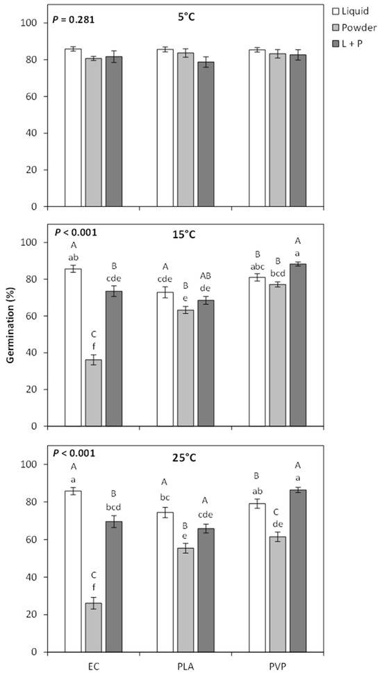 Mean germination percentage (±SE) of Penstemon palmeri seed that was treated with either ethylcellulose (EC), polylactic acid (PLA), or polyvinylpyrrolidone (PVP) polymers that were impregnated with gibberellic acid and applied to the seed as a liquid, powder, or a combination of powder and liquid. Seeds were germinated at 5, 10, and 25 °C. Within each temperature graph, differing lowercase letters indicate significant differences across all treatments, and differing capital letters indicate differences between the polymer application forms (P < 0.05).