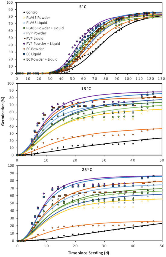 At 5 °C, there was no difference in seed germination among the treatments, but strong treatment effects were found from GA3 treatments at 15 °C and 25 °C (Figure 1). At 15 °C and 25 °C, applying GA3 to the seeds using a liquid coating tended to have higher germination than when GA3 was applied as a powder coating (Figure 1). This effect was particularly strong for EC coatings, where the seeds with the liquid coating had a 3.2 times higher rate of germination than the powdered coating. Applying GA3 through both a liquid and a powder coating did not improve germination more than just applying a liquid coating for EC and PLA polymers. For PVP coatings, a combination of liquid and polymer treatments had a slight improvement in germination over just applying a liquid treatment (~9% increase in germination at both 15 °C and 25 °C). Overall, the EC liquid coating and PVP with both liquid and powder coating tended to be statistically higher than the other seed treatments (Figure 1). Final seed germination for most GA3 treatments was dramatically improved over the control at 15 °C and 25 °C, ranging from 1.6- to 3.0-fold higher germination at 15 °C and 2.5–3.9-fold higher germination at 25 °C. The only treatment not higher than the control was EC powder at 25 °C (Figure 2).