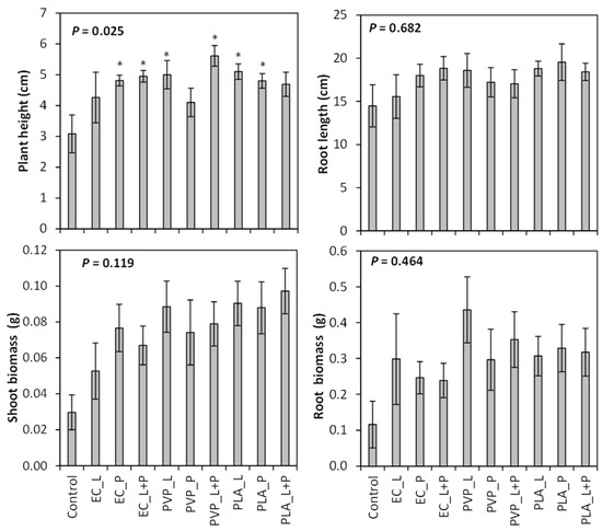 The seed treatments tested in this study resulted in plants with similar root lengths, shoot biomass, and root biomass (P > 0.05; Table S2). The shoot biomass results approached significance (P = 0.119, Figure 3). When the different seed coatings were compared with the control, plant height was increased for all seed coatings except for the EC liquid coating, PLA liquid + powder coating, and PVP powder coating (Table S3; Figure 3). Those seed coatings that increased shoot height had plants that were 51–82% taller than the control.