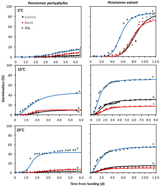 Cumulative germination from Penstemon pachyphyllus and P. eatonii seeds treated with a liquid EC gibberellic acid (GA3) coating, coated with no active ingredient (blank), and left untreated (control). The solid line represents cumulative germination over time estimated from a three-parameter log–logistic curve, and the symbols indicate germination recorded on a specific day. Differing lowercase letters indicate significant differences (P < 0.05) among treatments.