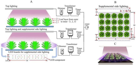 Schematic diagram of the lighting system used in the experiments. There were five groups of cultivation beds with five different experimental lighting treatments, which had two lighting patterns, as top lighting with LED panel and side lighting with line lamps. Each LED panel and line lamp was composed of a digital timer, dimmer, and transformer, used to maintain the lighting period and lighting intensity (A). Before the side lighting treatments, the fully expanded third leaves of lettuce plants, grown in the first row and second row at the edge of the top lighting illuminated area, were adjusted toward the side lamps. Starting from the fully expanded third leaves, in a clockwise direction, every three leaves were considered as one layer (just about one circle), and a total of three layers from the outer to the inner were collected, named layer 1 (eldest leaves), layer 2 (middle leaves), and layer 3 (young leaves) (A). The control (CK) group remained only top lighting. Four groups were exposed to both top lighting as CK and side lighting (A,C). The side lighting was employed for an additional 2 h per day after normal top lighting for 6 days before harvest. Each cultivation bed had four rows, and each row had five lettuce plants. The layout of lettuce plants and the relative parameters are shown in (B). Line lamps were installed 10 cm from the first row of hydroponic pots at the center of the cultivation panel on the side (B).