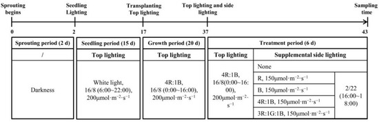 After a 20-day cultivation period, the lettuce plants in the five cultivation beds received different experimental lighting treatments. As shown in Figure 1, before the side lighting treatments, the fully expanded third leaves of lettuce plants, grown in the first row and second row at the edge of the top lighting illuminated area (named first row and second row), were adjusted toward the side lamps. Starting from the fully expanded third leaves, in a clockwise direction, every three leaves were considered as one layer (just about one circle), and a total of three layers from the outer to the inner were collected, named layer 1 (eldest leaves), layer 2 (middle leaves), and layer 3 (young leaves). The control (CK) group only maintained top lighting, with an average PPFD of 200 μmol·m−2·s−1 within a 16 h photoperiod (0:00–16:00), the ratio of red to blue light intensity was 4R:1B. Four groups were exposed to both top lighting and side lighting. As shown in Figure 2, the side lighting of different quality line lamps’ PPFD was 150 μmol·m−2·s−1, with a photoperiod of 2 h (16:00–18:00). The side lighting line lamps adopted a combination of red, green, and blue LED components (Foshan Haolaite Optoelectronics Technology Co. Ltd., Foshan, China). The size of the side lighting line lamps was 50 × 3.6 × 2.4 cm3, with a red-light wavelength of 660 ± 2 nm and a green-light wavelength of 525 ± 2 nm. The wavelength of blue light was 445 ± 2 nm. At the end of irradiation, samples were taken from the leaf layers 1, 2, and 3 of each plant with eliminated petiole. Each leaf layer had three leaves and was mixed as biological replicates. The collected leaves were immediately frozen in liquid nitrogen and stored at −80 °C for future analysis. There were five different experimental lighting treatments, represented as CK, R, B, RB, and RGB (Figure 2). CK denoted lettuce plants grown only under top lighting of 200 μmol·m−2·s−1 PPFD (4R:1B, PPFD), without any side lighting treatment (Figure 3A), while R, B, RB, and RGB denoted plants grown under both top lighting as CK and with side lighting of red, blue, red:blue (4R:1B, PPFD), and red:green:blue (3R:1G:1G, PPFD) at 150 μmol·m−2·s−1 PPFD of the first row lettuce and at 60 μmol·m−2·s−1 PPFD of the second row lettuce (Figure 3B). The side lighting was employed for an additional 2 h per day after normal top lighting for 6 days before harvest. The top lighting PPFD was measured 10 cm above the center of the water culture pot of all rows on the cultivation plant plate, where the orientation of measurement was toward the top light lamps and without any lettuce plants. Side lighting PPFD was measured 10 cm above the center of the water culture pot of first row on the cultivation plant plate, where the orientation of measurement was toward side lamps and without any lettuce plants.