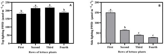 The distribution of PPFD for top lighting (A) and side lighting (B) of lettuce plants in different rows over the illuminated area of the plant plate of hydroponic cultivation beds. The top lighting PPFD was measured 10 cm above the center of the water culture pot of all rows on the cultivation plant plate, where the orientation of measurement was toward the top light lamps and without any lettuce plants. Side lighting PPFD was measured 10 cm above the center of the water culture pot of first row on the cultivation plant plate, where the orientation of measurement was toward side lamps and without any lettuce plants. Bars represent the standard deviation (n = 5). Different small letters represent significant differences between treatments within different rows of lettuce plants by Duncan’s multiple range test at p ≤ 0.05.