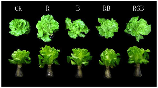 In this assay, 37-day-old seedlings were employed under different types of supplemental side lighting. It was obvious that under CK treatment, the growth morphology of lettuce canopy in the first row was compact, while under side lighting, the lettuce canopy was relatively loose and had a large crown width, and the outer leaves of lettuce plants grew toward the side lamps (Figure 4).