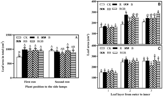 Leaf area in total plants (A), leaf area of the leaf layers (from outer to inner) of plants, grown in the first (B) and second (C) row toward side lamps, respectively, with or without supplemental side lighting of different qualities at 150 μmol·m−2·s−1 PPFD, measured 10 cm above the center of the water culture pot of the first row toward the side lamps. Bars represent the standard deviation (n = 4). Different capital letters represent significant differences between treatments and rows by Duncan’s multiple range test at p ≤ 0.05 (A). Different small letters represent significant differences between treatments within each leaf layer separately by Duncan’s multiple range test at p ≤ 0.05.