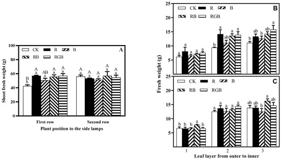 Shoot fresh weigh of whole plant (A) and fresh weight of leaf layer, grown in the first (B) and second (C) row toward side lamps, respectively, with or without supplemental side lighting of different qualities at 150 μmol·m−2·s−1 PPFD, measured 10 cm above the center of the water culture pot of the first row toward the side lamps. Bars represent the standard deviation (n = 4). Different capital letters represent significant differences between treatments and rows by Duncan’s multiple range test at p ≤ 0.05 (A). Different small letters represent significant differences between treatments within each leaf layer separately by Duncan’s multiple range test at p ≤ 0.05.