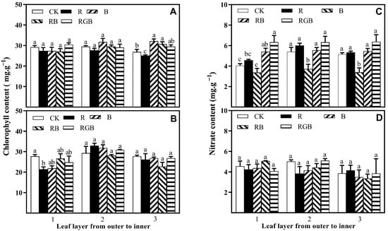 Chlorophyll content and nitrate content in the leaf layers (from outer to inner) of plants, grown in the first (A,C) and second (B,D) row toward side lamps, respectively, with or without side lighting of different qualities at 150 μmol·m−2·s−1 PPFD, measured 10 cm above the center of the water culture pot of the first row toward the side lamps. Bars represent the standard deviation (n = 4). Different small letters represent significant differences between treatments within each leaf layer separately by Duncan’s multiple range test at p ≤ 0.05.