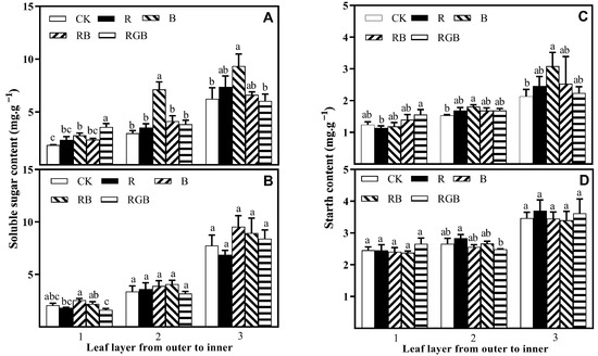 Soluble sugar content and starch content in the leaf layers (from outer to inner) of plants, grown in the first (A,C) and second (B,D) row toward side lamps, respectively, with or without side lighting of different qualities at 150 μmol·m−2·s−1 PPFD, measured 10 cm above the center of the water culture pot of the first row toward side lamps. Bars represent the standard deviation (n = 4). Different small letters represent significant differences between treatments within each leaf layer separately by Duncan’s multiple range test at p ≤ 0.05.