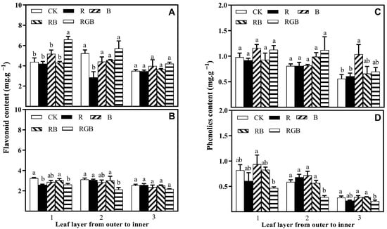 Flavonoid content and phenolics content in the leaf layers (from outer to inner) of plants, grown in the first (A,C) and second (B,D) row toward side lamps, respectively, with or without side lighting of different qualities at 150 μmol·m−2·s−1 PPFD, measured 10 cm above the center of the water culture pot of the first row toward side lamps. Bars represent the standard deviation (n = 4). Different small letters represent significant differences between treatments within each leaf layer separately by Duncan’s multiple range test at p ≤ 0.05.