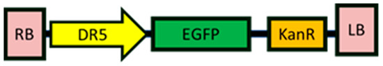 To better understand the distribution of auxin in the growing points of watercress, we used the DR5::EGFP plasmid that had been constructed previously (Figure 1). The DR5 promoter was cloned and inserted in front of the green fluorescent protein (GFP), and the expression of the GFP gene was induced by the DR5 promoter.