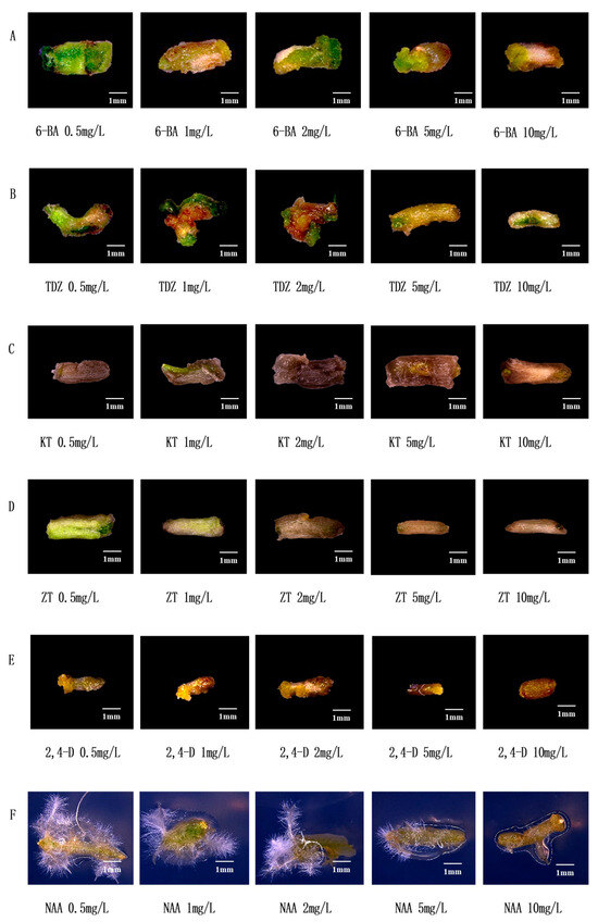 Effect of common plant hormones on stem segments of watercress. (A) Effect of 6-BA on stem segments of watercress. (B) Effect of TDZ on stem segments of watercress. (C) Effect of KT on stem segments of watercress. (D) Effect of ZT on stem segments of watercress. (E) Effect of 2,4-D on stem segments of watercress. (F) Effect of NAA on stem segments of watercress.