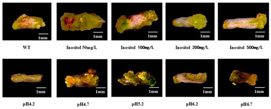 Inositol and culture medium pH had obvious effects on plant tissue dedifferentiation and callus formation. We took the regeneration system as control and observed the stem segment of watercress by adding different inositol concentrations and setting different pH. Figure 3 shows that the addition of 50 mg/L inositol to the original regeneration system can promote callus expansion. When the pH was close to 5.2, the number of calli formed at the wound of the stem segment was significantly higher. Therefore, adding 50 mg/L inositol to the regeneration system and adjusting pH to 5.2 can form a more efficient regeneration system.