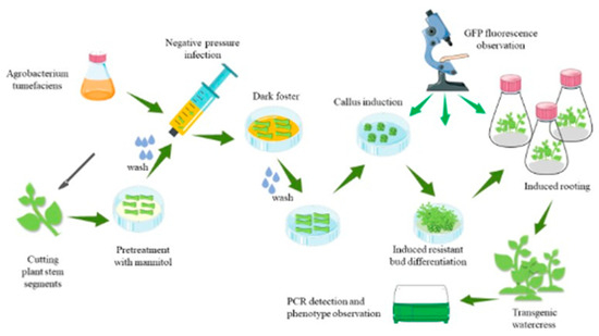 As shown in Figure 5, the first step is to prepare A. tumefaciens and stem segments of the watercress. The second step is to pretreat the stem segments, and the third step is to infect the stem segments with an injection syringe for 3 min. The fourth step involves co-cultivation of the stem segments with A. tumefaciens in darkness. The fifth step is to induce callus formation by washing the stem segments and placing them in a specific medium. The sixth step is to induce the callus to form resistance buds. The seventh step involves the induction of resistant buds to form roots, and the eighth step involves the cultivation of plants with resistance through domestication and planting.