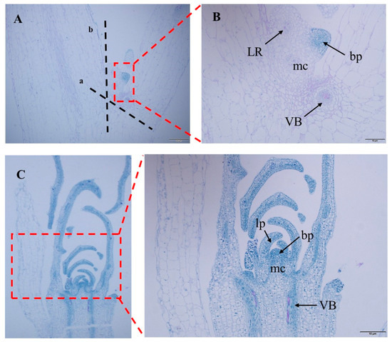 Meristem tissue slice of watercress. (A) Watercress leaf axil slice. (B) Enlarged view of leaf axil slice. (C) Slice of growth points of watercress. ab—cut point of watercress stem section. LR—root primordium. mc—meristematic cell. bp—bud primordium. lp—leaf primordium. VB—vascular bundle.