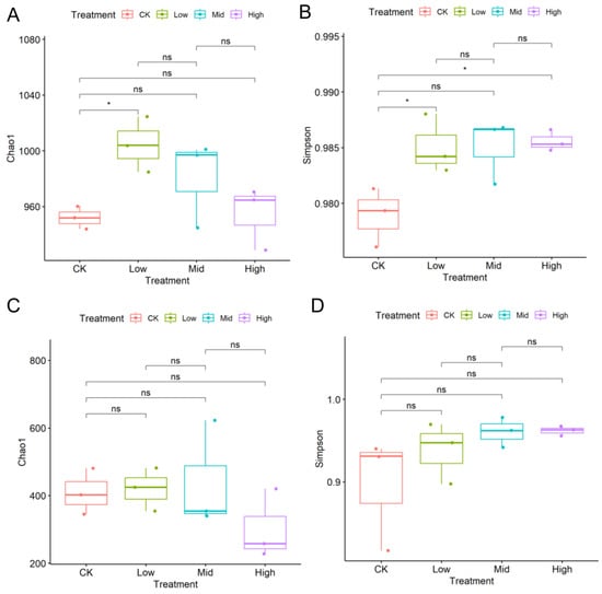 The Chao1 richness indexes and Simpson diversity indexes of the bacterial community (A,B) and fungal community (C,D) across different biochar content levels; ns indicates not significant. * means significant difference (p < 0.05).