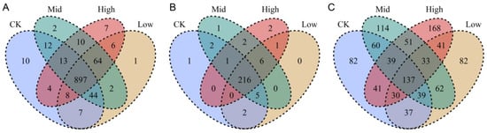 The Venn diagrams of OTUs in the bacterial community (A), families in the bacterial community (B) and OTUs in the fungal community (C). CK indicates the control-check group, low indicates biochar addition with a content of 2% (BC2), mid indicates biochar addition with a content of 3% (BC3) and high indicates biochar addition with a content of 4% (BC4).
