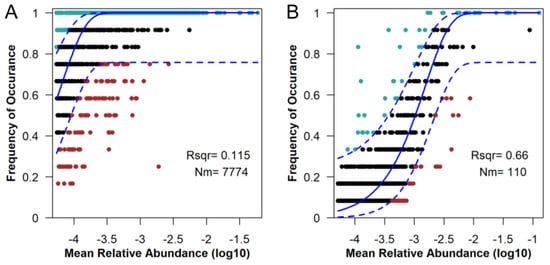 The predicted occurrence frequencies for the bacterial community (A) and fungal community (B). The solid blue line is the best fit to the neutral community model, and the dashed blue line indicates 95% confidence intervals around the prediction. OTUs that occur more or less frequently than predicted by the neutral community model are shown in green or red, respectively; while OTUs that occur frequently similar to the prediction are shown in black. Nm represents the fit model parameter. Rsqr represents the fit to this model. A higher Rsqr indicates higher stochasticity explaining community assembly processes.