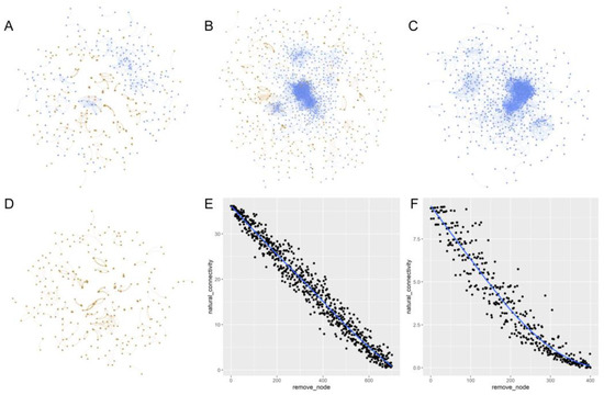 The network graphs of the microbial community at two significant levels. Co-occurrence networks were structured based on Spearman correlations between any OTU pair, with a coefficient threshold of 0.88 and significance thresholds of 0.001 (A) or 0.05 (B), based only on bacterial OTUs (C) and only on fungal OTUs (D) with a coefficient threshold of 0.88 and significance thresholds of 0.05, respectively. Each node signifies an OTU, which could correspond to a microbial population. In all the four figures (A–D), colors of the nodes indicate different major phyla. Blue nodes represent bacterial OTUs, and orange nodes represent fungal OTUs. (E,F) mean the robustness of the bacterial community network (E) and the fungal community network (F); where the blue lines represent the ideal values of natural connectivity of the networks and the black dots represent the observed values of the connectivity after the nodes were removed randomly.
