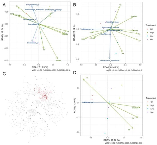 The correlation analysis of soil microorganisms. (A,B,D) responses of microbial community components to soil nutrients based on redundancy analysis. (C) Means the Key modular in the microbial co-occurrence network based on the indicator OTUs. Green arrows indicate soil nutrients, and blue arrows indicate dominant OTUs. CK indicates the control-check group, low indicates biochar addition with a content of 2% (BC2), mid indicates biochar addition with a content of 3% (BC3), and high indicates biochar addition with a content of 4% (BC4). SOM indicates soil organic matter, TN indicates total nitrogen, AP indicates available phosphorus, Na indicates natrium, TK indicates total potassium, AK indicates available potassium, the NP ratio indicates the ratio of total nitrogen and total phosphorus and Gradient indicates the biochar content level.