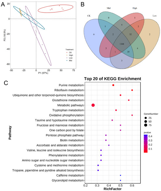 The metabolomics analysis. (A) Partial least squares discrimination analysis (PLS-DA) of metabolite components in different biochar levels. (B) Venn diagram with the number of metabolites at the different biochar levels. (C) Enriched KEGG pathways based on differential metabolites along the biochar gradient.
