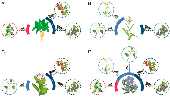 CaPsol transmission multi-test involving sugar beet (A), maize (B), tobacco (C), and the experimental plant periwinkle (D). Populations of specific cixiid vectors associated with the respective host plant are depicted in the surroundings of each plant. Red lines indicate tuf-a CaPsol epidemiological route including HobsUd, light blue lines depict tuf-b CaPsol routes vectored by HobsCa and HobsCf, and dark blue lines correspond to RqCm and RqPs populations transmitting tuf-d type CaPsol.
