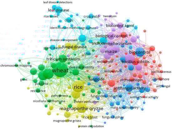 In this work, we retrieved bibliometric data on the biocontrol of the leaf diseases of cereals by using the SCOPUS database of which we chose the specific keywords to carry out this operation: “Cereals” or “Wheat” or “Rice” or “Maize” or “Biological Control Agents” or “Leaf diseases”. The VOS viewer (v1.6.9., Leiden University, Leiden, The Netherlands) processing software was used to create the bibliometric analysis. The study displays the distribution of the most pertinent publications regarding the biocontrol of diseases infecting cereal leaves by advantageous microorganisms. The results of the network analysis show a relationship between the keywords discovered and the general perspective of current investigations in the field (Figure 1).