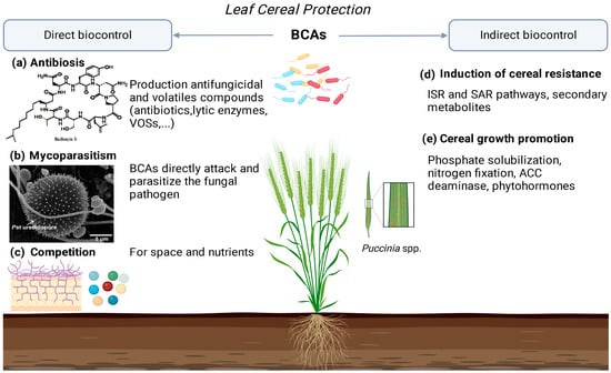 Various national action plans in Europe have been drawn up to reduce the application of traditional synthetic fungicides in farming and actively support the development of environmentally and less harmful plant protection agents [126]. BCAs, commonly known as bio fungicides, are a viable alternative strategy for cereal pests and protection, fostering sustainable agriculture practices through their environmentally friendly use. BCAs exert a direct antagonistic impact on the pathogen through parasitism, antibiosis, or competition, achieved by secreting natural compounds. They also exert their biocontrol activity indirectly by induced systemic resistance (ISR) in cereals. Widely studied for its potential benefits, this approach aims to reduce reliance on chemical substances for plant protection, effectively controlling cereal diseases [127,128] (Figure 3).